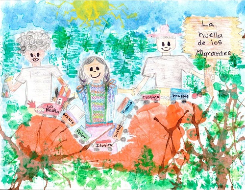La niña Mitla Mariana Catalina Romero Aguilar, originaria de Coquimatlán, Colima, obtuvo, en la categoría de 9 a 11 años de edad, el segundo lugar por su dibujo titulado “La huella de los migrantes”, en el concurso organizado por el Sistema Nacional para el Desarrollo Integral de la Familia SNDIF, en coordinación con la Procuraduría Federal de Protección de Niñas, Niños y Adolescentes.