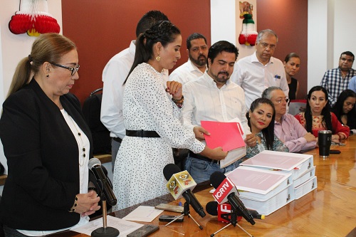 Ante los medios de comunicación, la Auditora Superior del Estado entregó los legajos impresos, así como la versión completa y la versión pública digital textada a los legisladores Julio Anguiano Urbina y Ana María Sánchez Landa, presidentes de las Comisiones de Hacienda, Presupuesto y Fiscalización de los Recursos Públicos; y de Vigilancia del Osafig, en ese orden.