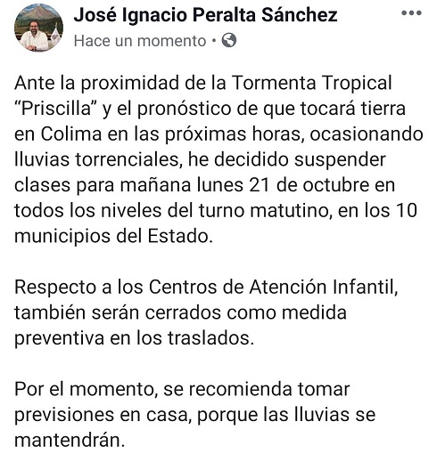 Derivado de los efectos de la Tormenta Tropical Priscilla y el pronóstico de que tocará tierra en Colima en las próximas horas, ocasionando lluvias torrenciales, se suspenden las clases en todos los niveles del turno matutino de este lunes 21 de octubre, en los 10 municipios del Estado, anunció el gobernador José Ignacio Peralta Sánchez.