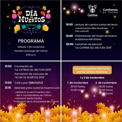 El Ayuntamiento de Colima, a través de la Dirección de Educación, Cultura y Recreación, invitan a las familias colimenses a disfrutar de las actividades y presentaciones artísticas, que se llevarán a cabo en el marco del Festival de Día de Muertos 2019, el próximo 2 de noviembre en el Panteón Municipal de Colima.