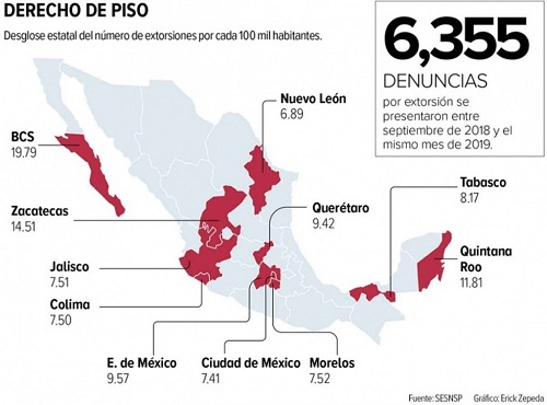 Entre los focos rojos están Baja California Sur, con 19.79 extorsiones por cada 100 mil habitantes; Zacatecas (14.57); Quintana Roo (11.81); Estado de México (9.57); Querétaro (9.42); Tabasco (8.17); Morelos (7.52); Jalisco (7.51); Colima (7.50) y la Ciudad de México con 7.41 casos.