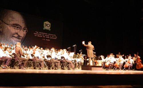 En el Teatro Universitario Coronel Pedro Torres Ortiz, se dio la cita familia Gandhi, para presenciar la actuación del Coro del Colegio con la participación de la Orquesta de la Nueva Escuela Mexicana, dirigida por el maestro José Manuel Frausto Zamora. El programa que se presentó incluyó las piezas: Marcha de la Sinfonía No. 1, Concierto III con violino oblligato, Suite del Opera Carmen, Ave María, The Barber of Sevilla, Vais sur ton chemin, Oh Fortuna (Carmina Burana), Star Wars.