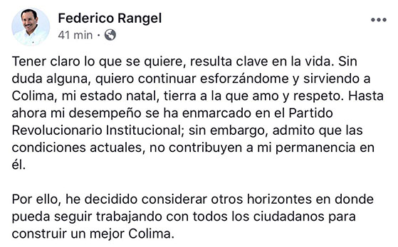 El ex presidente municipal de Colima, Federico Rangel Lozano, dio a conocer a través de su cuenta de Facebook su decisión de separarse del Partido Revolucionario Institucional (PRI) partido en el que militó durante varios años y donde obtuvo varios cargos, entre ellos dirigente sindical de la Sección 39 del SNTE, diputado local, presidente municipal y presidente del Comité Directivo Municipal del PRI en Colima.
