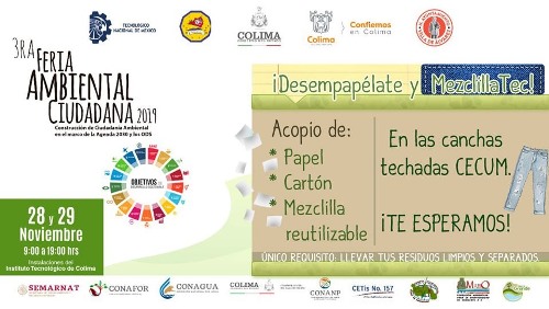 El próximo jueves 28 y viernes 29 de noviembre se llevará a cabo en el Instituto Tecnológico de Colima (ITC), la tercera edición de la Feria Ambiental Ciudadana “Construcción de Ciudadanía Ambiental, en el marco de la Agenda 2030 y Desarrollo Sostenible”.
