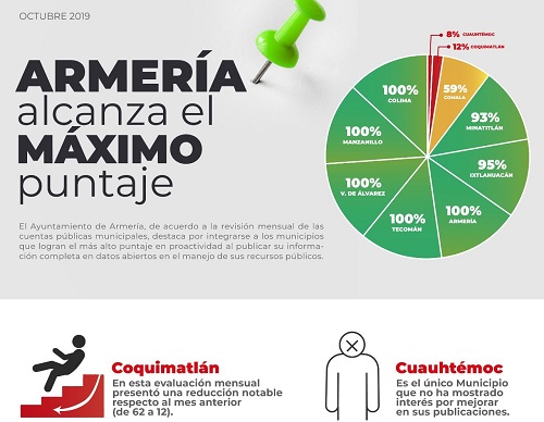 De acuerdo al análisis mensual correspondiente del Ranking de Transparencia Proactiva realizado por la Organización ¿Cómo vamos? Colima, el Ayuntamiento de Armería, de acuerdo con la revisión mensual de las cuentas públicas municipales, se integró a los municipios que logran el más alto puntaje en proactividad al publicar su información completa en datos abiertos en el manejo de sus recursos públicos.
