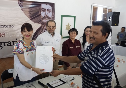 Acompañada del gobernador del Estado de Colima, José Ignacio Peralta Sánchez, de la diputada local Claudia Aguirre Luna y de principales funcionarios de instituciones estatales y federales del sector agrario, la diputada federal hizo la entrega simbólica de títulos de derecho de usos común en los ejidos La Rosa de San José de Lumber, de la colonia de El pacifico y del ejido Las Juntas, que representaron simbólicamente la entrega de más de cien títulos parcelarios en el Estado.