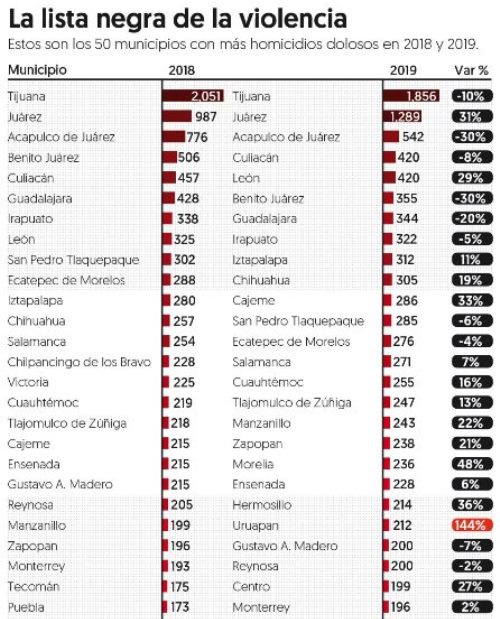 Como en 2018, Tijuana, Baja California; Ciudad Juárez, Chihuahua, y Acapulco, Guerrero, son las que continúan a la cabeza, en ese orden.