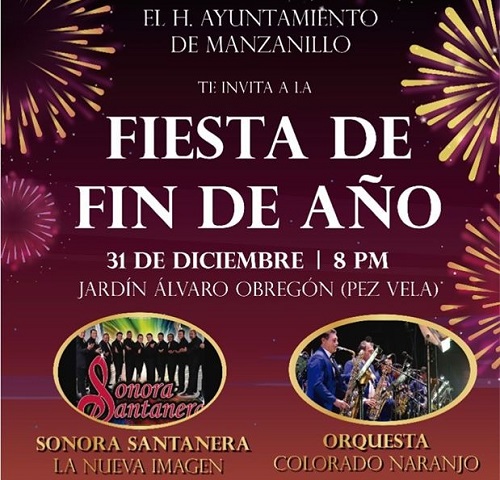 A las 10 de la noche iniciará el baile con la presentación de la Sonora Santanera Nueva Imagen y luego del mensaje de año nuevo y los fuegos pirotécnicos, la Orquesta Colorado Naranjo subirá al escenario para poner el buen ambiente entre las familias que acudan a celebrar de esta gran fiesta, al Jardín “Álvaro Obregón” mejor conocido como la explanada del Pez Vela.