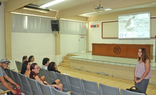 María José Ferrer Aguilar, alumna de posgrado en Bilogía Marina proveniente de la Universidad de Algarve Faro, Portugal, y quien realiza una estancia de investigación en la Facultad de Ciencias Marinas de la Universidad de Colima, campus Manzanillo, explicó algunos aspectos y resultados preliminares de su trabajo de investigación acerca de la caracterización de la actividad acústica en los delfines recurrentes del Pacífico mexicano.