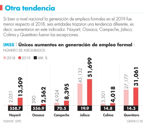 *Colima pasó de de 3,501 a 4,018 empleos generados *Seis estados libran declive en generación de empleos: Nayarit, Oaxaca, Campeche, Jalisco, Colima y Querétaro, únicos en incrementar su mercado laboral formal en el 2019.