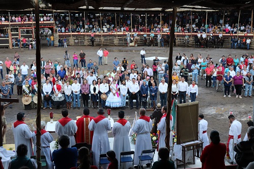 Posteriormente inició la misa de bendición de la plaza La Petatera, en honor de dicho Santo Patrono, ceremonia religiosa oficiada por el Presbítero Jesús Ramos Hueso, a la que se dieron cita cientos de ciudadanos con sus familias, así como autoridades, entre ellas el Presidente Municipal Felipe Cruz Calvario, su esposa y Presidente del DIF Municipal Sandra Patricia Ceballos Polanco; la Síndico Karina Heredia, regidoras, regidores, integrantes del Patronato y colaboradores del Ayuntamiento.