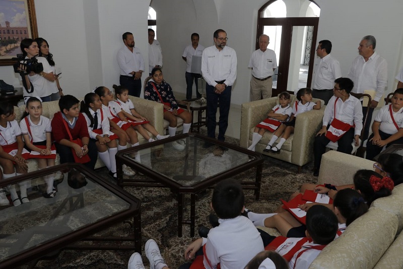 Acompañado de los secretarios de Educación, Jaime Flores Merlo; de Cultura, Carlos Ramírez Vuelvas y, de Administración y Gestión Pública, Kristian Meiners Tovar; el mandatario estatal recibió a una veintena de alumnas y alumnos de la Escuela Primaria Libro de Texto Gratuito, a quienes les dio la bienvenida y les comentó que este día se cumple el primer año en que se instauraron las visitas guiadas a la residencia oficial.