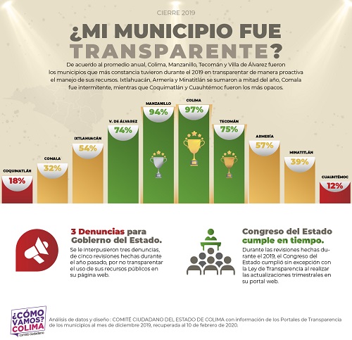 De acuerdo a los análisis realizados durante el 2019, Colima se galardona como el municipio más constante en transparencia proactiva al obtener un promedio anual de 97 por ciento, le sigue Manzanillo con 94 puntos porcentuales y finalmente cierra los primeros tres lugares Tecomán con puntaje de 75. Sin embargo, reconocemos a los municipios que se fueron sumando en el transcurso de los meses a esta iniciativa, tales como Villa de Álvarez, Ixtlahuacán, Armería y Minatitlán, que en conclusión destacan por ser los más comprometidos y constantes en transparentar de manera proactiva sus cuentas públicas.