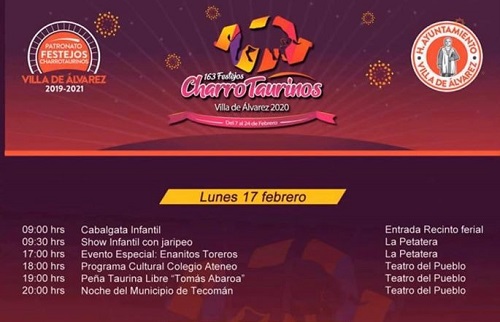 Villa de Álvarez, Col. El Presidente Municipal de Villa de Álvarez, Felipe Cruz Calvario, invitó a disfrutar del programa de los 163 Festejos Charrotaurinos, este lunes 17 de febrero, en el que destacan la Cabalgata Infantil y el espectáculo de los Enanitos Toreros.