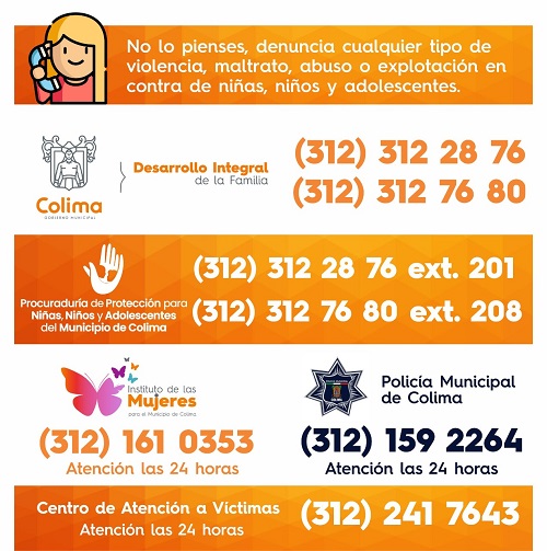 DIF Municipal Colima, de 8.30 am a 9:00 pm, (312) 31-22876, (312) 31-27680; Instituto de las Mujeres para el Municipio de Colima (312) 161 0356 las 24 horas del día; Policía Municipal de Colima 312 159 2264, las 24 horas; Procuraduría de Protección para Niñas, Niños y Adolescentes del Municipio de Colima: (312) 31-21876, (312) 31-22876, extensiones 201 y 208 y el Centro de Atención a Víctimas 312 241 7643, las 24 horas.