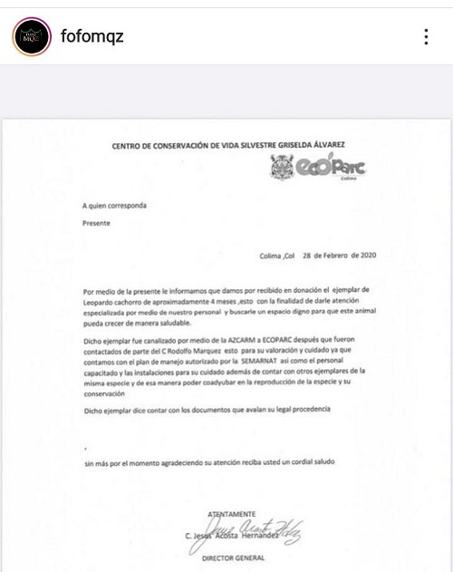 El influencer Rodolfo Márquez conocido en sus redes sociales como “Fofomqz” dio a conocer en su Instagram que hizo la donación de un Leopardo cachorro al Centro de Conservación de Vida Silvestre Griselda Álvarez “Ecoparc”.