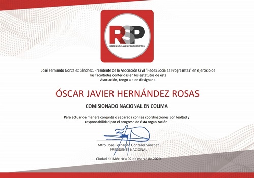 El presidente nacional de Redes Sociales Progresistas (RSP), José Fernando González Sánchez, nombró a Óscar Javier Hernández Rosas como comisionado nacional de RSP en Colima.