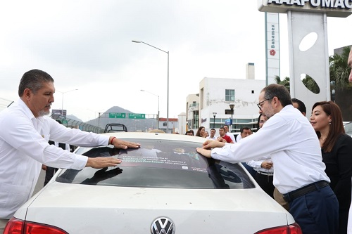 Al finalizar el evento, asistentes acompañaron al gobernador al exterior del Auditorio, para colocar engomados alusivos a la Campaña “La Violencia se Puede Prevenir” en vehículos particulares y del servicio público de transporte.