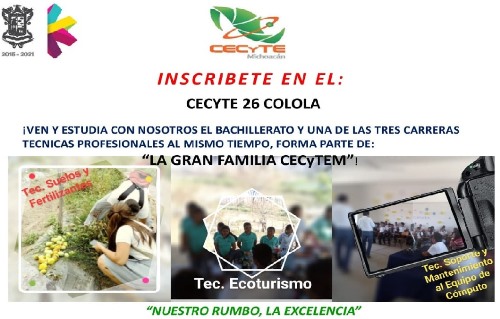 Aquila, Mich. En la costa aquilense, desde la localidad de Colola, el CECyTEM 26 está invitando a todos los jóvenes que están por terminar su secundaria, a inscribirse desde ahora para el siguiente ciclo escolar que inicia actividades en el próximo mes de agosto, en el plantel donde pueden estudiar la carreras técnicas profesionales de Técnico en suelos y fertilizantes; Técnico en turismo, y Técnico en soporte y mantenimiento de equipo de cómputo.