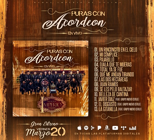 La banda Imperio de Colima estrenará el próximo viernes 20 de Marzo su nuevo CD titulado "Puras con Acordeón".