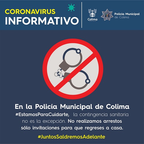 La Policía Municipal de Colima, realiza rondines por toda la ciudad, para invitar a los ciudadanos a permanecer en casa, de esta manera se está evitando que en los espacios públicos haya acumulación de personas, además se ha intensificado la vigilancia en colonias y comunidades, así como en zonas comerciales, ante esta contingencia.