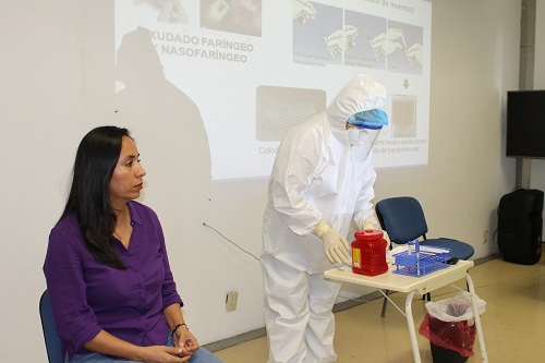 En el encuentro, se explicó que la muestra de elección es un exudado faríngeo y nasofaríngeo, que están contenidos en un tubo con medio de transporte, ya que inicialmente el virus se aloja en la cavidad interior de la garganta y en los poros nasales.