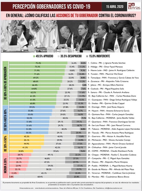 Caso contrario, son siete los gobernadores que no superan el 30 por ciento de aprobación por las acciones realizadas en contra del Coronavirus, ellos son: en el lugar 32 el Gobernador de Morelos con apenas el 5.8% de aprobación; en el lugar 31 está Veracruz con 12.4%; mientras que en el 30 se encuentra Estado de México con el 22.1%; el 29 Puebla y 28 Oaxaca, con el 23.9 y 25.1 por ciento respectivamente; por su parte Campeche ocupa el sitio 27 con el 25.7% y el Gobernador del estado de Chiapas con el 28.7%.