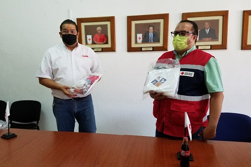 El Delegado Estatal de Cruz Roja, Héctor Galindo Vázquez, agradeció las muestras de solidaridad y respaldo ofrecido por parte dela Fundación Coca-Cola y la Embotelladora Coca-Cola de Colima representadas por Julio Salas y David Munro respectivamente, por realizar una donación de insumos médicos correspondientes a 300 overoles Tyvek, dos mil guantes quirúrgicos, 3 capsulas aislantes de camilla, dos mil cubre bocas N-95 y 12 galones de gel desinfectante.