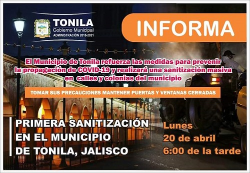 Tonila, Jal. Con el objetivo de prevenir la propagación del Covid-19 (coronavirus), el Ayuntamiento de Tonila, Jalisco, realizará una sanitización masiva en calles y colonias del municipio.