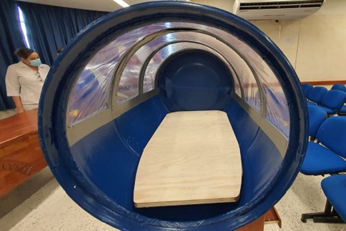 En cuanto a su elaboración, dijo que se hizo una capsula básica para paciente, otra para pacientes pediátricos y otra más avanzada que tendrá acceso de asistencia con oxígeno y que también se podrá ir apoyando al paciente introduciendo las manos a la cápsula, además de que fueron elaboradas con materiales accesibles y fácil desinfección.