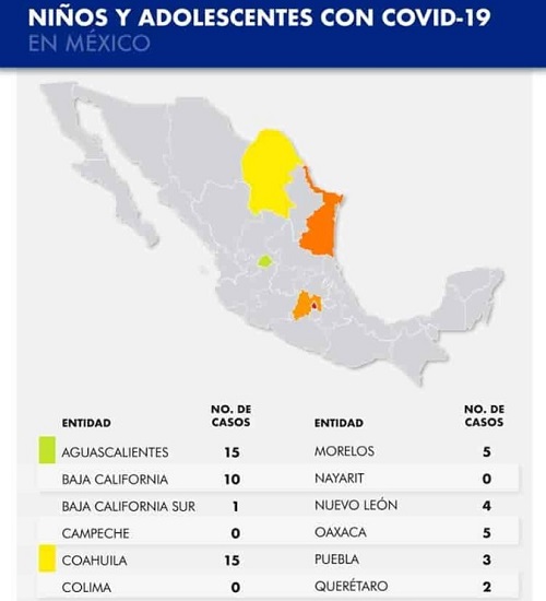Dichas estadísticas difundidas por la Secretaria de Salud, y retomadas por el portal informativo La Silla Rota, se da a conocer que en el país se han registrado un total de 272 menores entre los cero y los 17 años de edad han dado positivo a covid19, ellos representan el 1.62% de los casos confirmados en el país.
