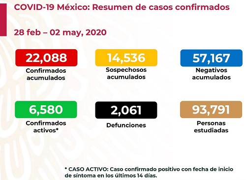 MÉXICO.- Al corte de hoy sábado 2 de Mayo de 2020, en nuestro país se ha superado la barrera de las 2 mil muertes como consecuencia de la Pandemia de SarsCov2, conocido como el nuevo Coronavirus Covid-19.