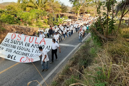 Aquila, Mich. Este sábado por la tarde, la Comunidad Indígena de Santa María Ostula realizó una manifestación en la carretera costera de Michoacán a la altura de la localidad de Xayakalan, para expresar con una leyenda pintada en una manta, que Ostula se suma en apoyo al gobierno federal y estatal en sus acciones en contra del CJNG.