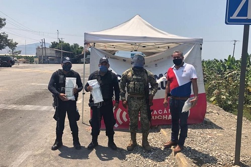 En las tareas del filtro sanitario instalado por el Ayuntamiento de Coahuayana desde el 24 de marzo, participan personal de Protección Civil municipal y de la Dirección de Fomento a la Salud, así como elementos de la Policía Michoacán, Guardia Nacional, Secretaría de Marina Armada de México y Secretaría de la Defensa Nacional.