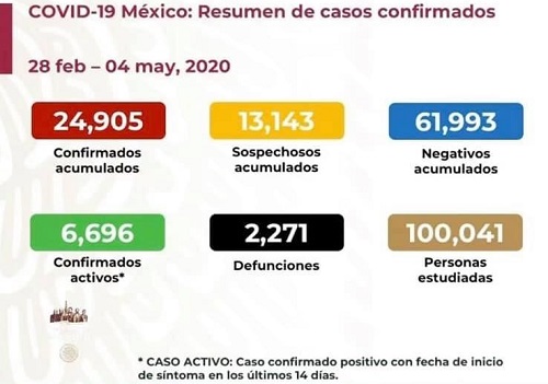 MÉXICO.- La República Mexicana está en el umbral de rebasar los 25 mil casos positivos de Coronavirus, pues al corte de este lunes 4 de mayo, ya son un total de 24 mil 905 casos confirmados, según informaron esta noche el Dr. José Luis Alomía, Director General de Epidemiología, y el Dr. Hugo López-Gatell Ramírez, Subsecretario de Prevención y Planeación de la Salud, en la conferencia de prensa que cada noche ofrece la Secretaría de Salud desde Palacio Nacional.