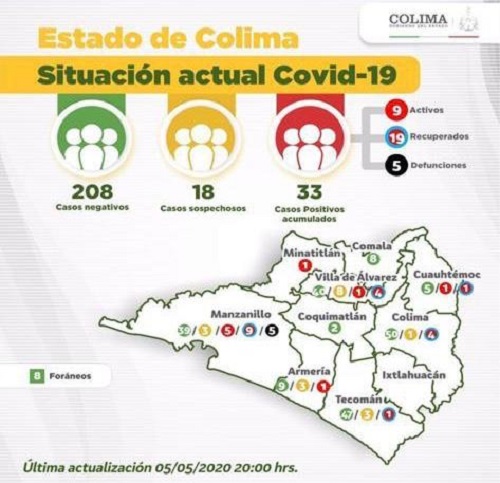 Con 2 nuevos casos confirmados de personas residentes de Manzanillo y uno diagnosticado en Ciudad de México, que reportó residencia de Cuauhtémoc, el estado de Colima llega a 33 casos positivos al virus del SARS-CoV-2.