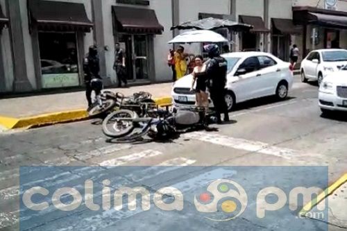 Dos motociclistas de la Policía Estatal que realizaban su recorrido por el centro de la ciudad de Colima fueron chocados por alcance, al momento de estar esperando la luz roja del semáforo, por la conductora de un vehículo compacto, esto por la calle Filomeno medina casi esquina con Francisco I. Madero, en el centro de la ciudad de Colima.