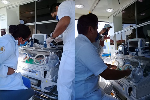 Acompañado de su madre y personal médico de dicho hospital, se logró su estabilización, preparación y enlace administrativos para su aceptación en el Instituto Nacional de Perinatología.