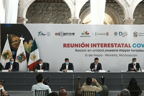 Lo anterior fue uno delo acuerdos tomados en la reunión Interestatal Covid-19 realizada en Morelia, Michoacán, en donde se dieron cita los gobernadores de los estados de Durango, Nuevo León, Tamaulipas, Coahuila, Colima, Michoacán y el Secretario General de Gobierno de Jalisco, en donde su anfitrión, Silvano Aureoles Conejo, en conferencia de prensa dio a conocer los cinco acuerdos a los que llegaron.