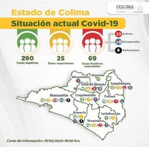 De esta manera por número de casos Manzanillo tiene 38, Tecomán y Villa de Álvarez 8 cada uno, Cuauhtémoc tiene 6, Colima 5, Armería 2 y con 1 están Coquimatlán y Minatitlán.