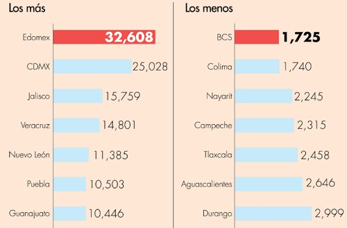 En cambio, las entidades que recibieron mayores recursos económicos vía participaciones federales son: Edomex (32 mil 608 millones de pesos), Ciudad de México (25 mil 028 millones de pesos), Jalisco (15 mil 759 millones de pesos), Veracruz (14 mil 801 millones de pesos), Nuevo León (11 mil 385 millones de pesos), Puebla (10 mil 503 millones de pesos) y Guanajuato (10 mil 446 millones de pesos.