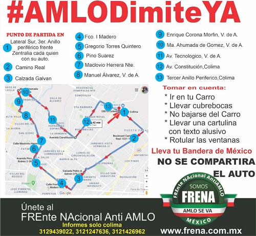 Debido a los malos resultados que ha mostrado hasta ahorita el presidente de México, Andrés Manuel López Obrador, además que todas sus promesas de campaña es pura mentira, el Frente Nacional AntiAMLO (FRENA) el próximo sábado realizará una caravana vehicular exigiendo la dimisión inmediata del ejecutivo federal.