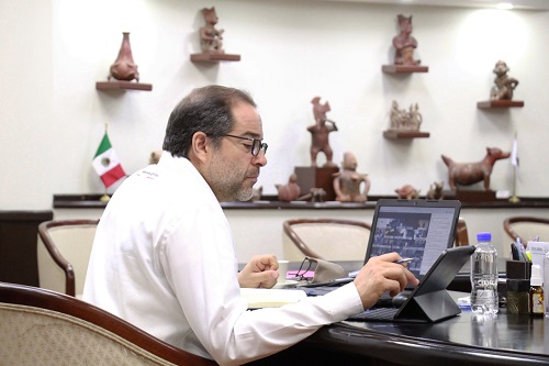 Dicha reunión virtual se dio en el marco de la coordinación de acciones y trabajos llevados a cabo entre los gobiernos estatales y gobierno federal para la mitigación del COVID-19 y su impacto en la economía nacional y en torno a la estrategia de implementación de regreso a la actividad económica.
