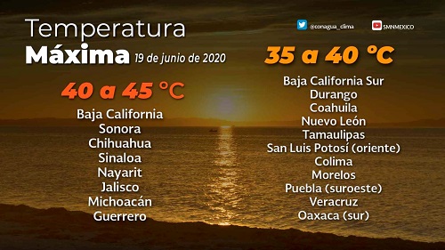 Y de 35 a 40 grados Celsius en Baja California Sur, Coahuila, Colima, Durango, Morelos, el suroeste de Puebla, Nuevo León, el sur de Oaxaca, el oriente de San Luis Potosí, Tamaulipas y Veracruz.