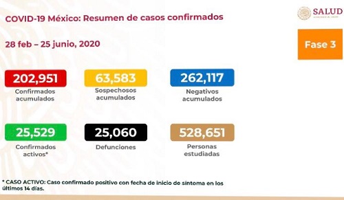 CIUDAD DE MÉXICO. El Dr. Hugo López Gatell, Subsecretario de Prevención y Promoción de la Salud, actualizó las cifras oficiales de la Pandemia del Covid-19 en la República Mexicana, al corte de hoy jueves 25 de junio de 2020: