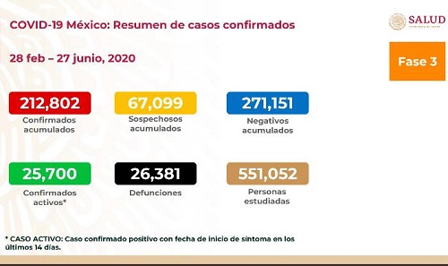 CIUDAD DE MÉXICO.- Al corte de hoy sábado 27 de junio de 2020, la Pandemia del nuevo Coronavirus SARS-CoV-2 ha dejado un total de 26 mil 381 fallecimientos en la República Mexicana.