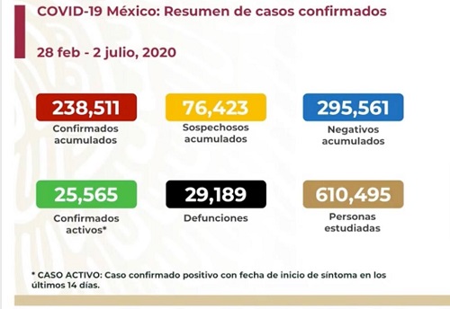 CIUDAD DE MÉXICO.- Al corte de hoy jueves 2 de julio de 2020, la Secretaría de Salud reporta un total de 29 mil 189 fallecimientos a consecuencia del virus SARS-Cov-2 en la República Mexicana.
