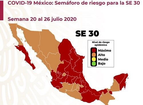 El semáforo epidemiológico por Covid-19 del 20 al 26 de julio tendrá a Colima y otros 17 estados en color rojo, es decir riesgo máximo de contagio, informó la Secretaría de Salud.