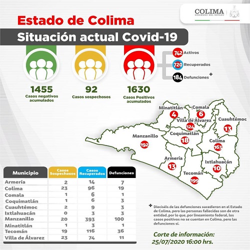 La Secretaría de Salud y Bienestar Social informa que los decesos ocurrieron en 2 mujeres que estaban hospitalizadas graves, una menor de 60 y la otra mayor de 65 años de edad; de Armería y Manzanillo, respectivamente.