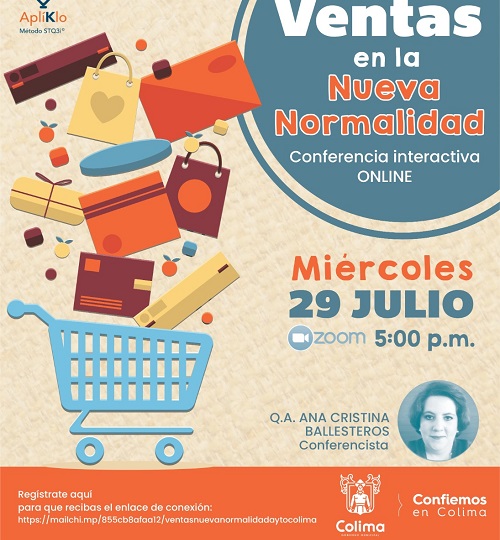 Este miércoles 29 de julio a las 5:00 p.m., el Ayuntamiento de Colima a través de la Dirección de Fomento Económico y Mejora Regulatoria, en colaboración con AplíKlo Consultoría, invitan a la Conferencia interactiva online gratuita “Ventas en la Nueva Normalidad”, impartida por Ana Cristina Ballesteros.